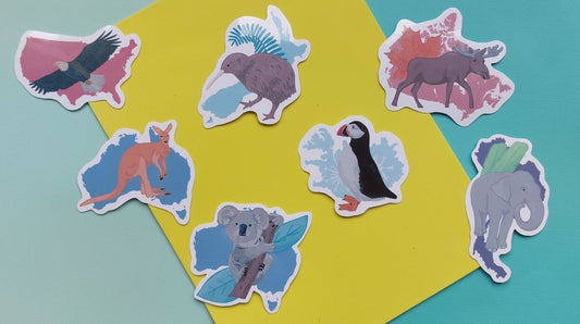 Travel stickers with a cute animal theme. These sticker feature a silhoutte of a country with an animal from that nation. Think elephants in Thailand, Alpacas in Peru and Highland Cows in Scotland.