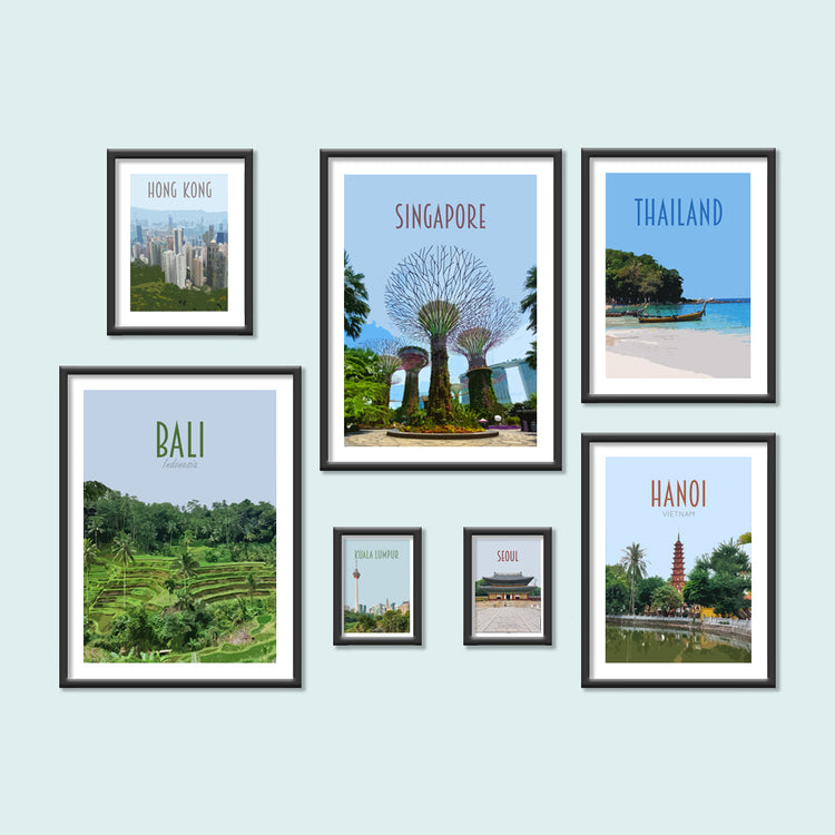 Browse retro vintage style travel posters of cities and places across Asia. From the beaches of Thailand to the cities of Malaysia and South Korea. Display your travel memories of backpacking asia with a gallery wall or postcard collection.