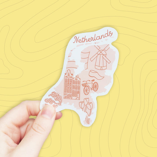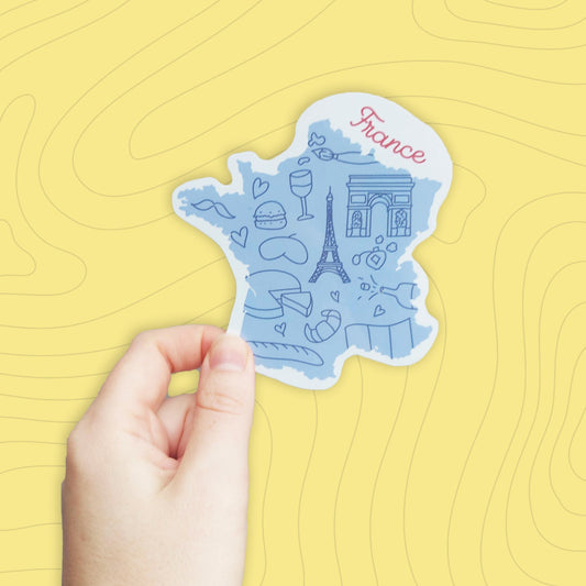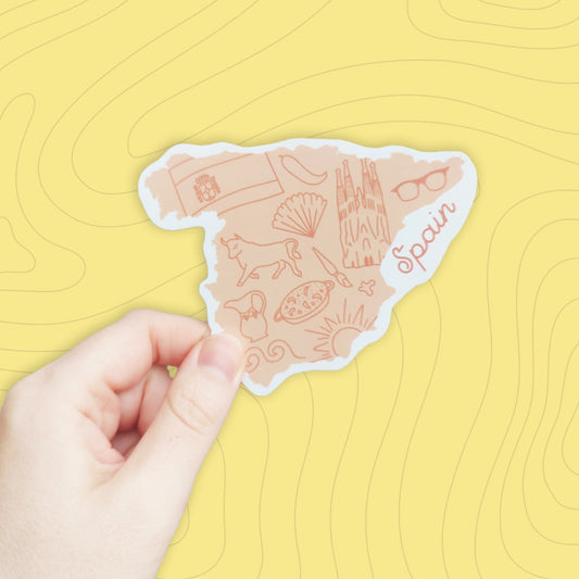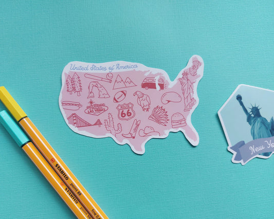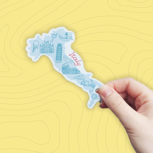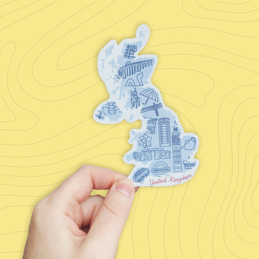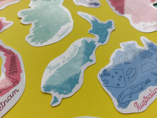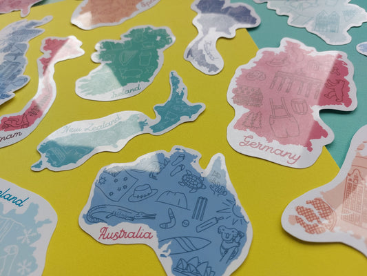 Colourful travel stickers based on countries around the world. Each sticker features doodles of icons, food and landmarks from that country inside it's silhouette. Sticker are printed on matt vinyl and coated in a laminate layer to ensure they are waterproof. Ideal for travel journals, scrapbooks, suitcases, laptops and more.