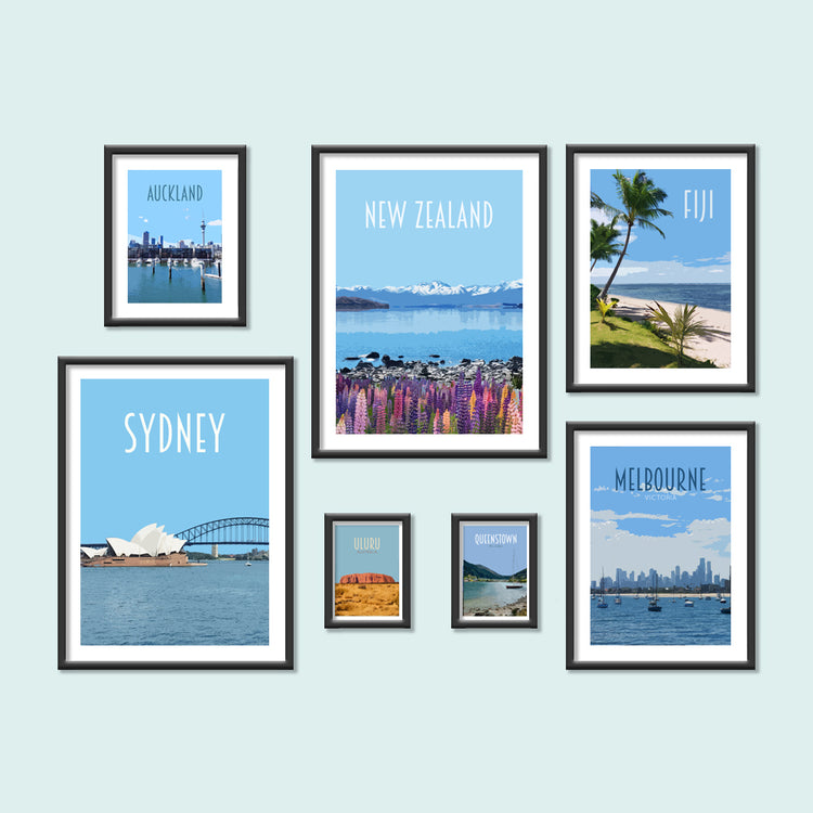 Find travel posters for your favourite places across Australia and New Zealand. Remember your travels by creating a gallery wall or collecting postcards of your top destinations. Here you will find retro vintage style travel prints of Melbourne, Sydney, Uluru, Wellington, Queenstown and more.