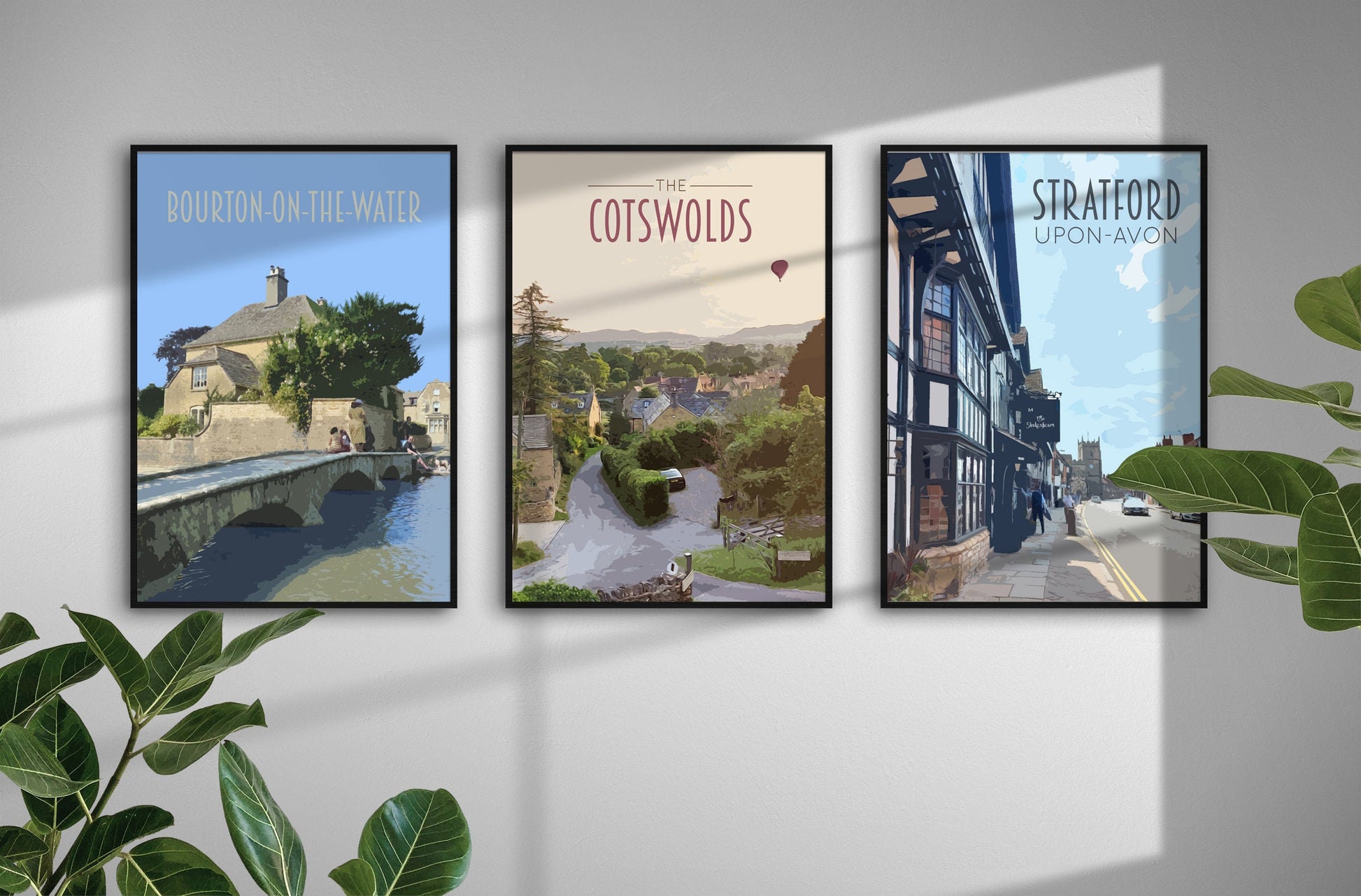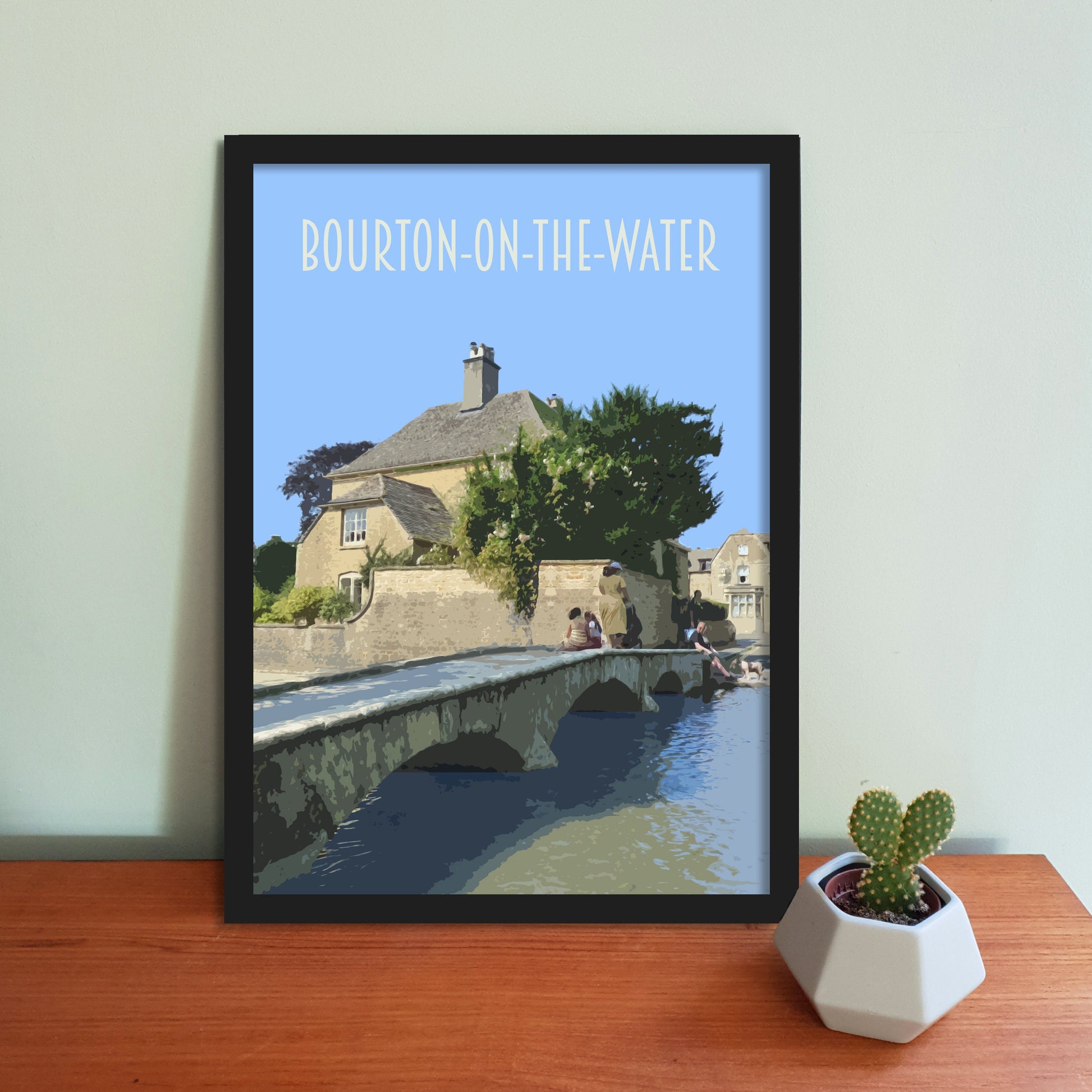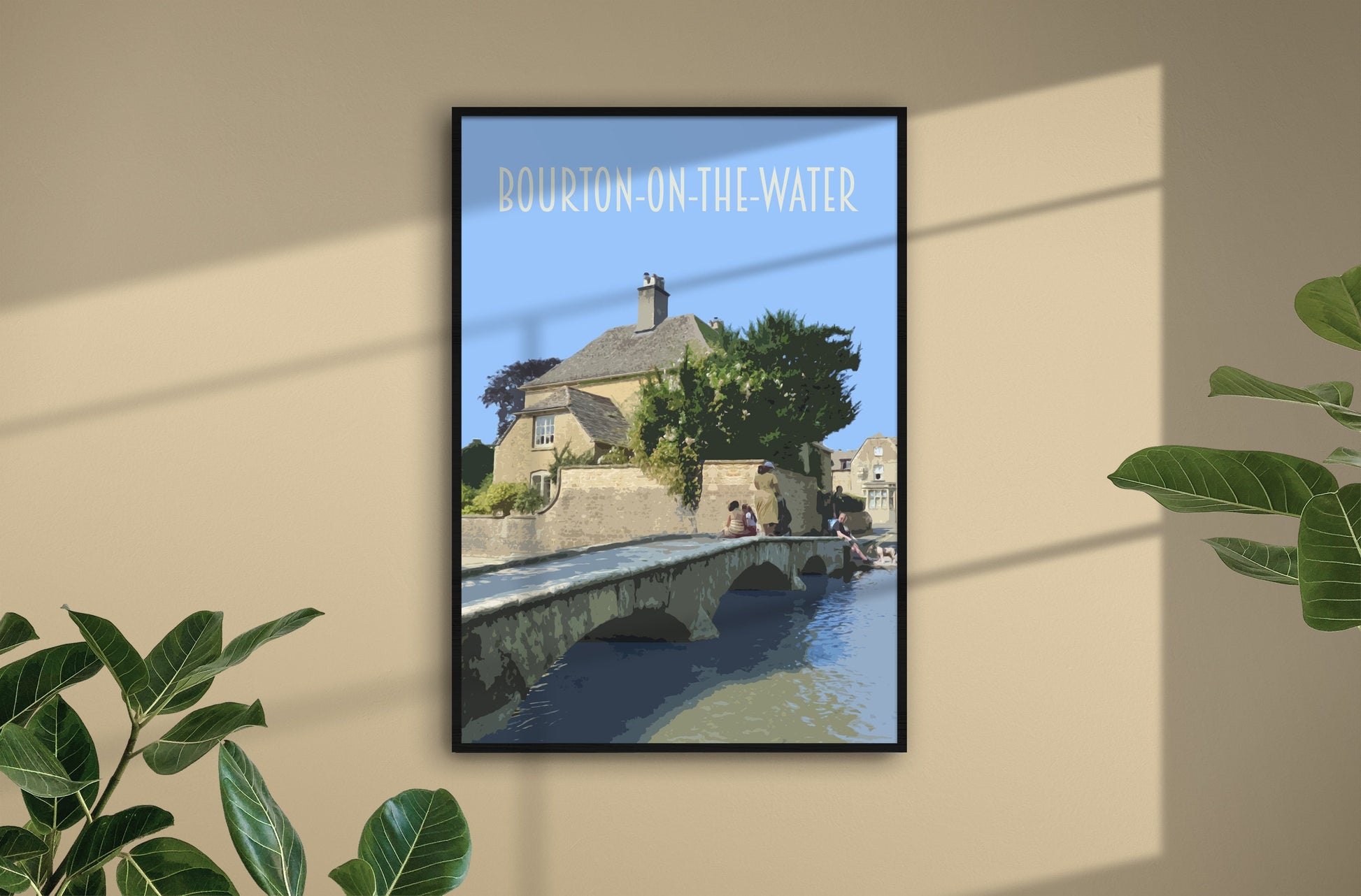Bourton-on-the-Water Travel Poster. Retro style travel print of the Cotswolds in the English Countryside. This poster shows the view over the village of Bourton-on-the-Water.