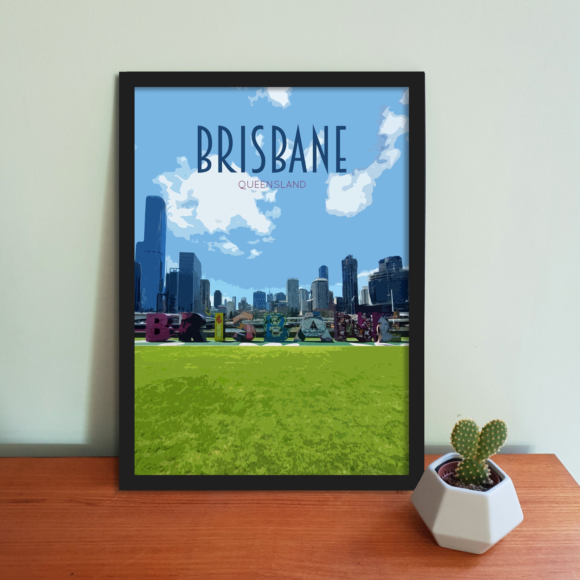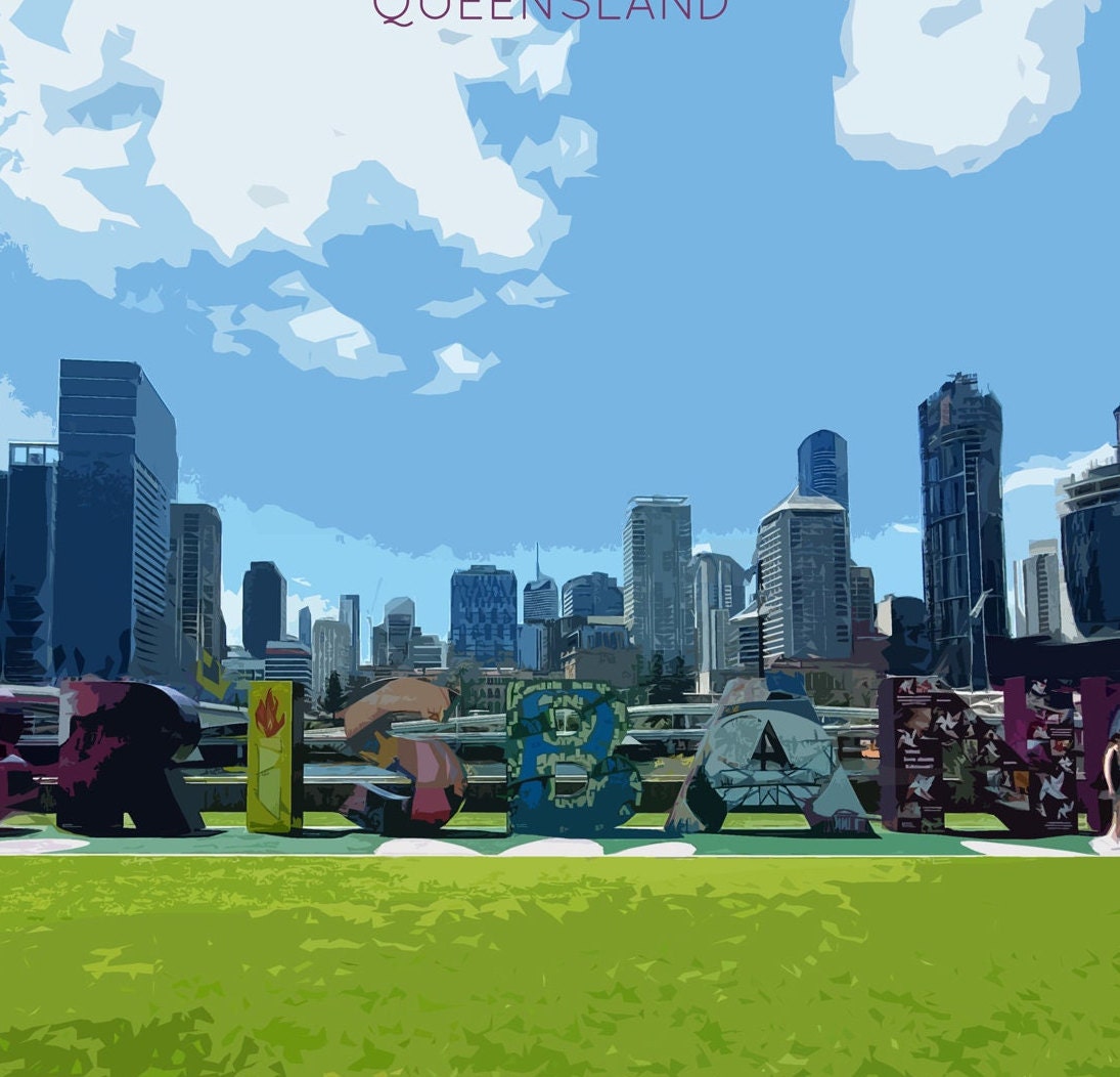 Brisbane Travel Poster. Retro style travel print of Brisbane, Queensland, Australia featuring the view from Southbank.