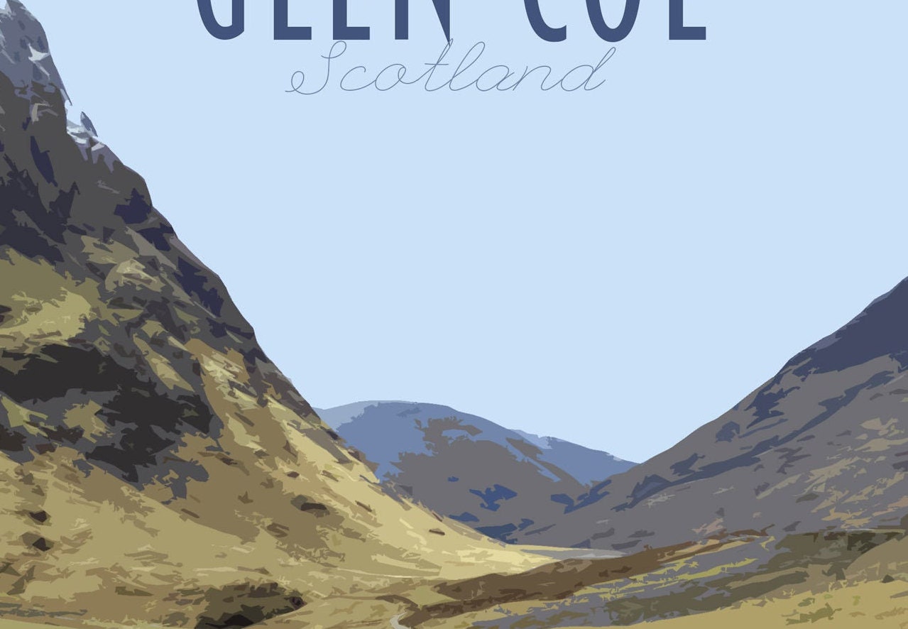 Glen Coe Travel Poster. Retro style travel print of Glen Coe in the Scottish Highlands.
