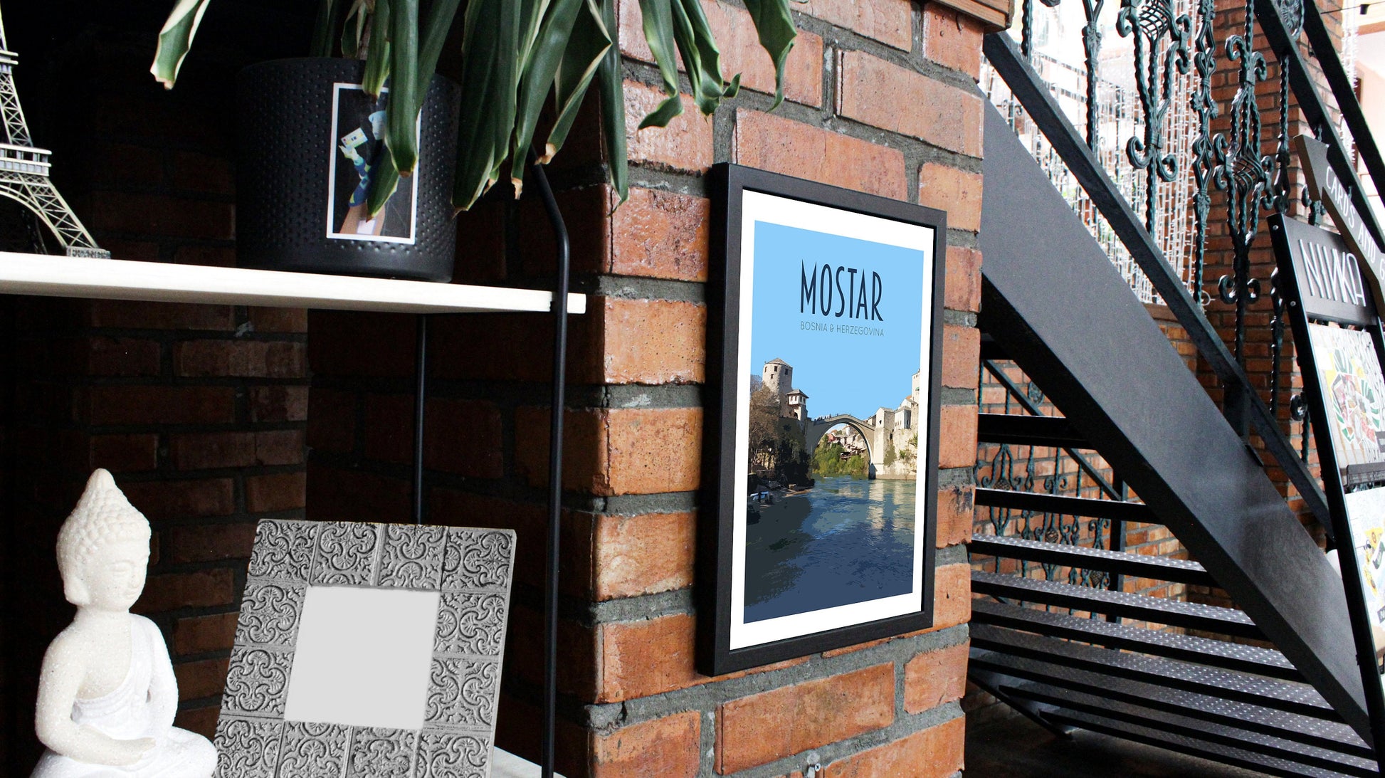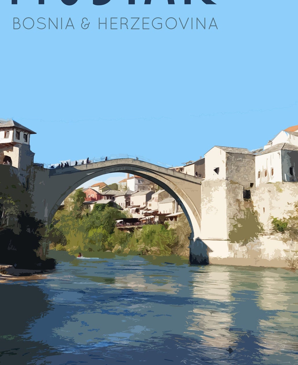 Mostar Travel Poster. Retro style travel print of Mostar, Bosnia and Herzegovina, featuring Mostar Old Bridge.